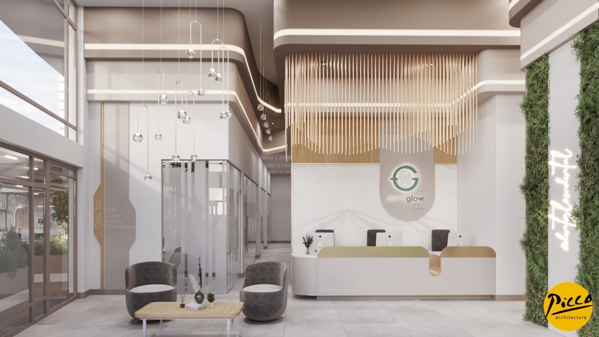 Dentglow Ağız ve Diş Sağlığı Polikliniği, İzmir ilinde 500 m2 kapalı alanı bulunan klinikte 7 adet box planlanmıştır. Tasarımda soft renkler tercih edilmiştir. Mat malzemeler yoğunlukta kullanılırken parlak malzemeler ile mekânın yansıması arttırılmıştır. Oval formlar ile köşeli hatların birlikte uyumu planlanmıştır. Koridorlarda malzeme bütünlüğü ile lineer görüntü sağlanmıştır. Tavan yüksekliğinde katmanlar ile farklı tavan yükseklikleri kullanılıp derinlik kazandırılmıştır.
