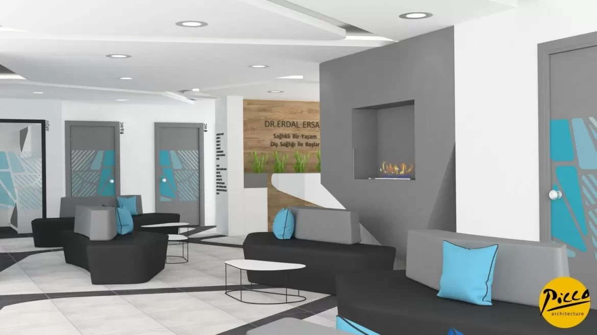 A different study was carried out in the waiting area and corridors of our polyclinic located in Bozkurt district of Denizli. The projection of the pattern on the entire ceiling is also embroidered on the floor, ensuring a unity in the entire space. The waiting chairs, designed to capture the same pattern, are designed to serve a high potential number of patients. With the special request of our doctor, a fireplace corner has been positioned in the waiting area. The clinic, where colors that evoke cleanliness and hygiene such as gray, blue and white, are used, brought warmth to the clinic with a wooden-detailed counter and artificial flowers behind it.
