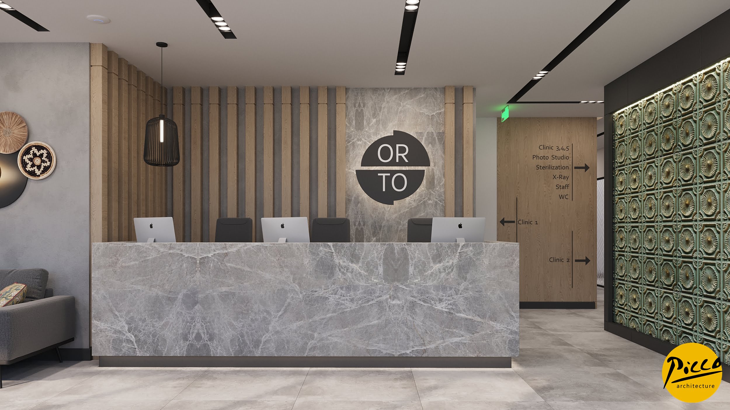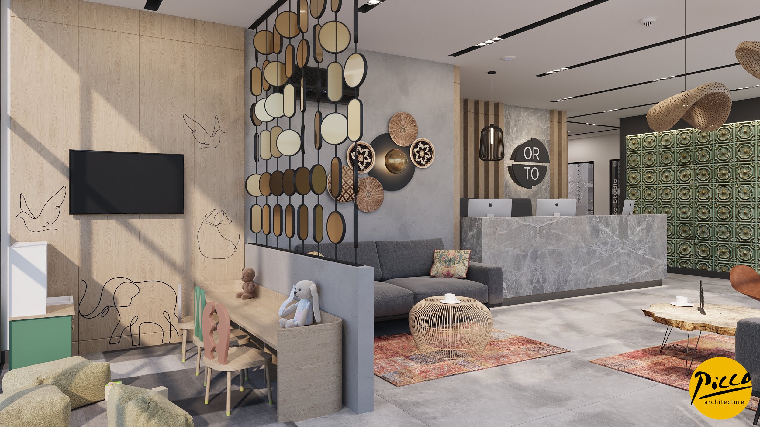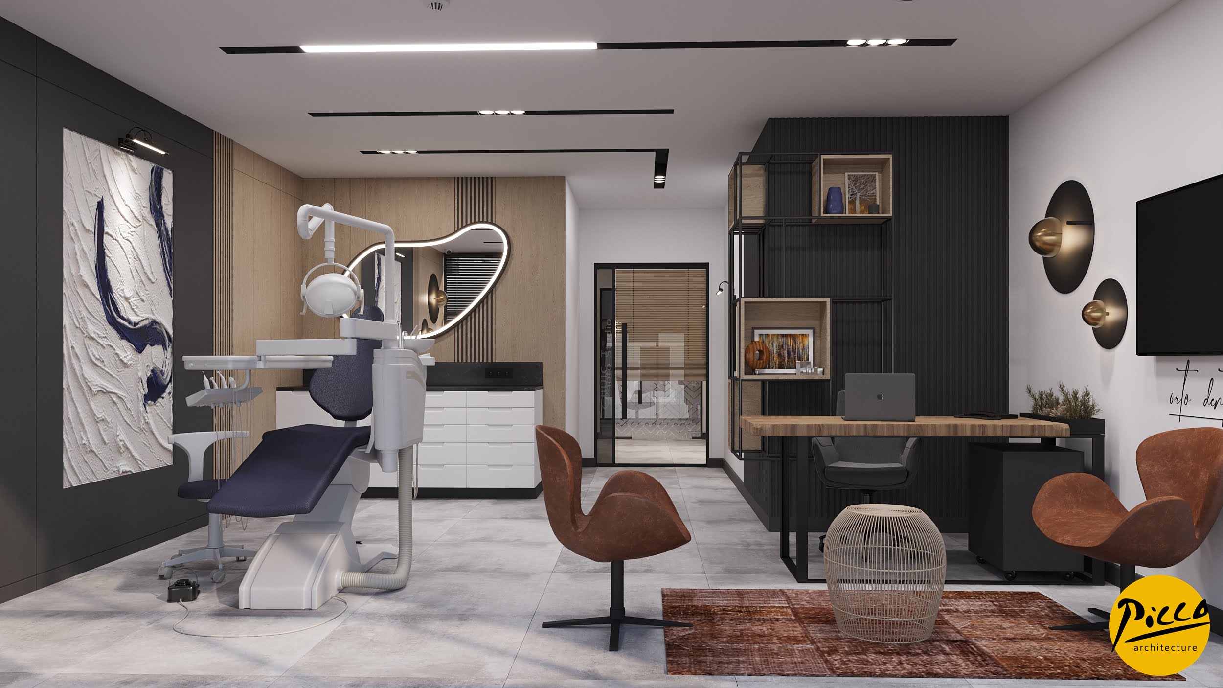 Orto Oral and Dental Health Polyclinic was planned and designed in a 3900 m2 closed area in İzmir province. It has been completed with a design approach made with natural materials without breaking away from the structure of nature. The textures were used in their most natural state to support the bohemian design concept. Different forms have come together in the design, which is completed with dark colors and the warmth of wood.