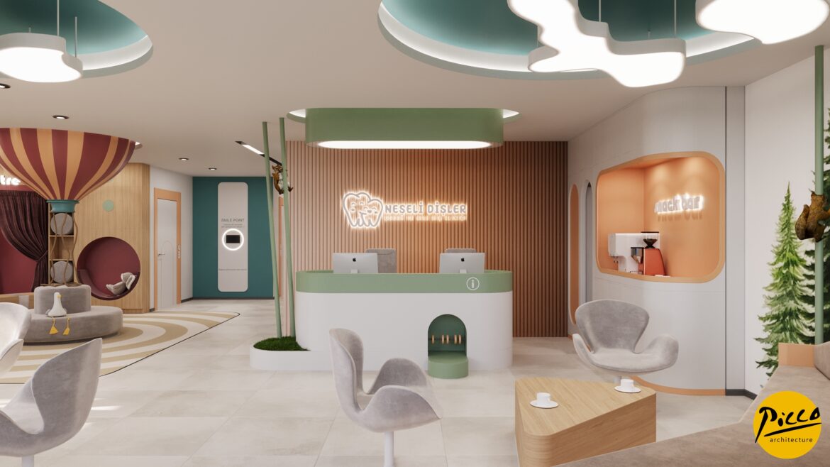 Neşeli Dişler Ağız ve Diş Sağlığı Polikliniği, Ankara ilinde 450 m2 kapalı alanı bulunan klinikte 6 adet box planlanmıştır. Poliklinik çocuklar için tasarlanmıştır. Tüm detaylar çocukların klinikten korkmadan güvenle vakit geçirmesi ve eğlenmesi için dikkatle tasarlanmıştır. Projelendirmede onların dünya bakış açısı ve yaklaşımı ile yola çıkılmıştır. Tasarım renklerinde soft renkler çocukları rahatlatan ortamla uyum sağlaması için dikkatle seçilmiştir. Mekânda tüm köşeler yumuşak hatlar ile tasarlanmıştır. İçeride bulunan birçok hayvan figürü ile birlikte çocukların eğlenmeleri amaçlanmıştır.