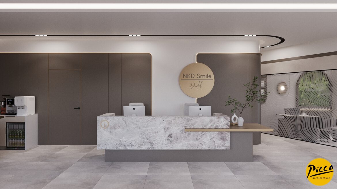 NKD Ağız ve Diş Sağlığı Polikliniği, Aydın ili Kuşadası ilçesinde 575 m2 kapalı alanı bulunan klinikte 4 adet box planlanmıştır. Derin tavan yüksekliği ile eğrisel form tüm bekleme alanında derinlik sağlamak için kullanılmıştır. Göz sınırlarını hizalamak için çizgisel hatlarla duvarlarda kontrast renk detayları çalışılmıştır. Renk geçişlerinde soft kontrast renkler kullanılmış gün ışığı ile birlikte ferah bir ortam amaçlanmıştır. Bina mimarisi gereği uzun bir yerleşim olması sebebi ile duvar bitimlerinde oval formlar ile mekân yumuşatılmıştır. İç mekân cam giydirmelerinde yine eğrisel formlar ile desteklenmiştir.